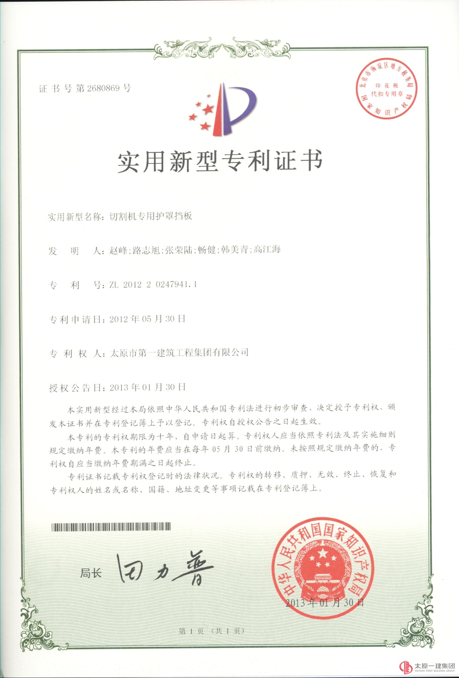 集團(tuán)公司于2013年1月30日取得了國家知識產(chǎn)權(quán)局頒發(fā)的5項(xiàng)專利證書:⑴鋼筋堆放專用卡具(專利號:ZL 2012 2 0247924.8);⑵切割機(jī)專用護(hù)罩擋板(專利號:ZL 2012 2 0247941.1);⑶施工手持燈可調(diào)節(jié)支架(專利號:ZL 2012 2 0247980.1);⑷軸線控制點(diǎn)保護(hù)裝置(專利號:ZL 2012 2 0250848.6);⑸組合式可拆卸鋼筋操作棚(專利號:ZL 2012 2 0250819.X)。