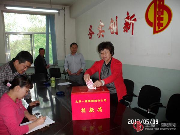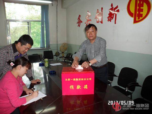 5月9日上午,四分公司組織舉行了以開展 “傳承美德,奉獻(xiàn)愛心”主題捐款獻(xiàn)愛心活動(dòng) 。四分公司機(jī)關(guān)所有人員及項(xiàng)目部代表參加了活動(dòng),分公司共39人共捐款2180元愛心款。其中太原實(shí)驗(yàn)小學(xué)合作方共捐款500元。