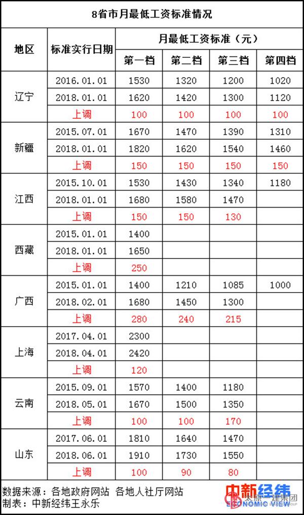 最低工資標(biāo)準(zhǔn)調(diào)整與失業(yè)人員、帶薪休假勞動(dòng)者、醫(yī)療期員工等人員的收入緊密相聯(lián),據(jù)中新經(jīng)緯客戶端不完全統(tǒng)計(jì),截至4月25日,已有遼寧、新疆、江西、西藏、廣西、上海、云南和山東8省市上調(diào)2018年最低工資標(biāo)準(zhǔn)。公開資料顯示,廣東、四川、安徽也將上調(diào)。目前來看,上海月最低工資已達(dá)2420元,在各省市中最高。