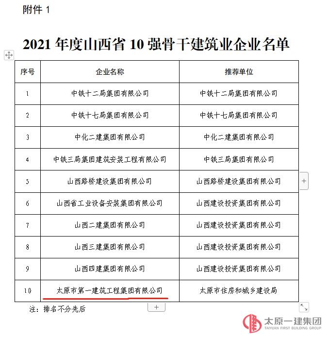 喜訊,經(jīng)集團(tuán)公司上下共同努力,我司被山西省住房和城鄉(xiāng)建設(shè)廳認(rèn)定為2021年度山西省10強(qiáng)骨干建筑業(yè)企業(yè),成績(jī)來(lái)之不易,我們要共同珍惜。