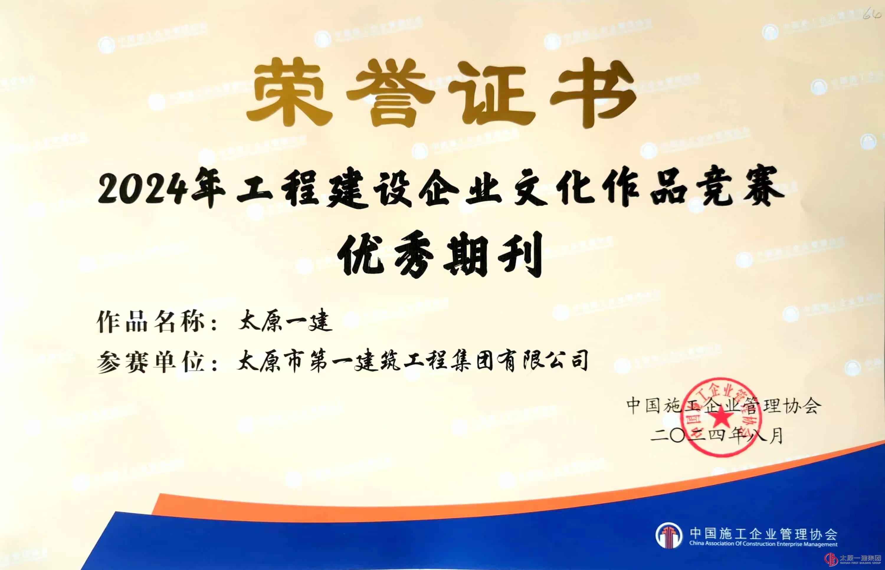 太原一建集團推送的《文化助力“五心”級服務 推動企業(yè)和諧穩(wěn)定發(fā)展》榮獲“優(yōu)秀案例”獎項,《太原一建》期刊獲評“優(yōu)秀期刊”稱號。